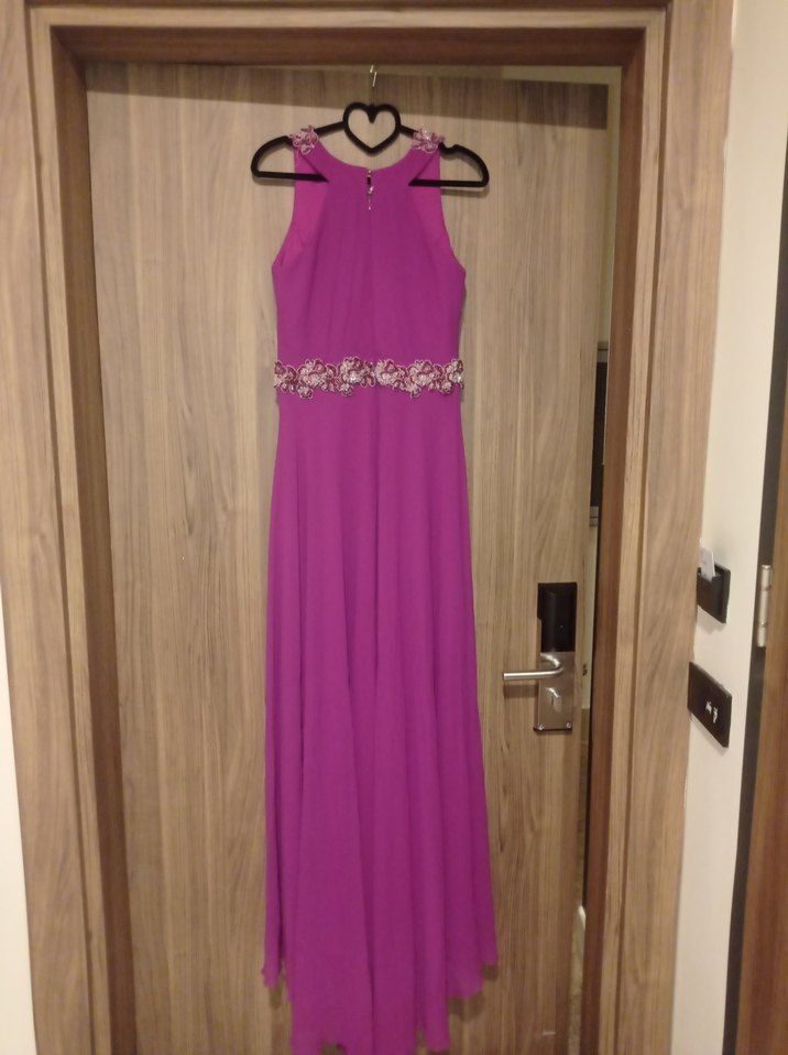 Mor Uzun Abiye Elbise İşlemeli Bel Detaylı
