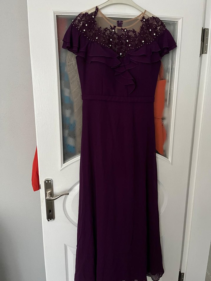 Koyu mor renk, v yaka ve kolsuz tasarıma sahip, drapeli ve çiçek işlemeli uzun abiye elbise. Düğünler için uygun klasik şıklık sunar.
