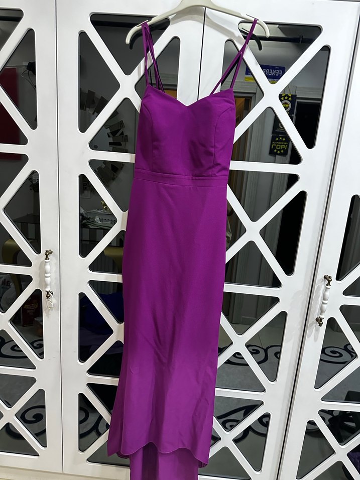 Mor uzun abiye elbise, askılı ve straplez.. Drapeli kesimi ve dar kalıbıyla düğünler için uygun, minimalist ve modern tarzda. Bir kere arkadaşımın düğününe giydim. Tertemiz.