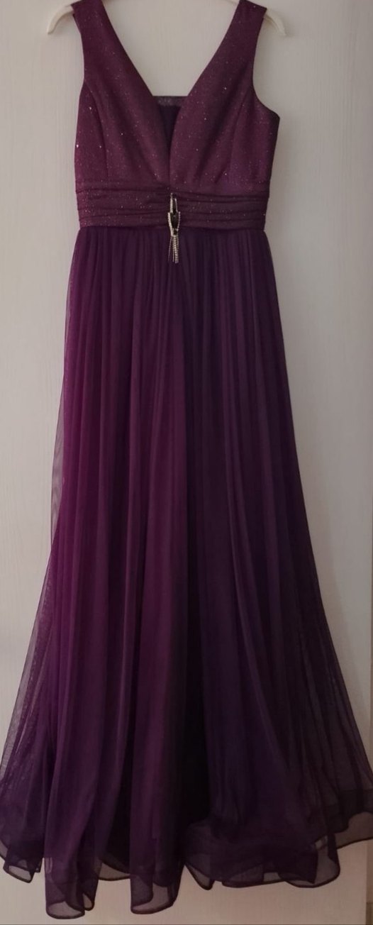 Koyu mor renkte, uzun boy, askılı ve V yakalı, drapeli, bol kesim kadın abiye elbisesi.