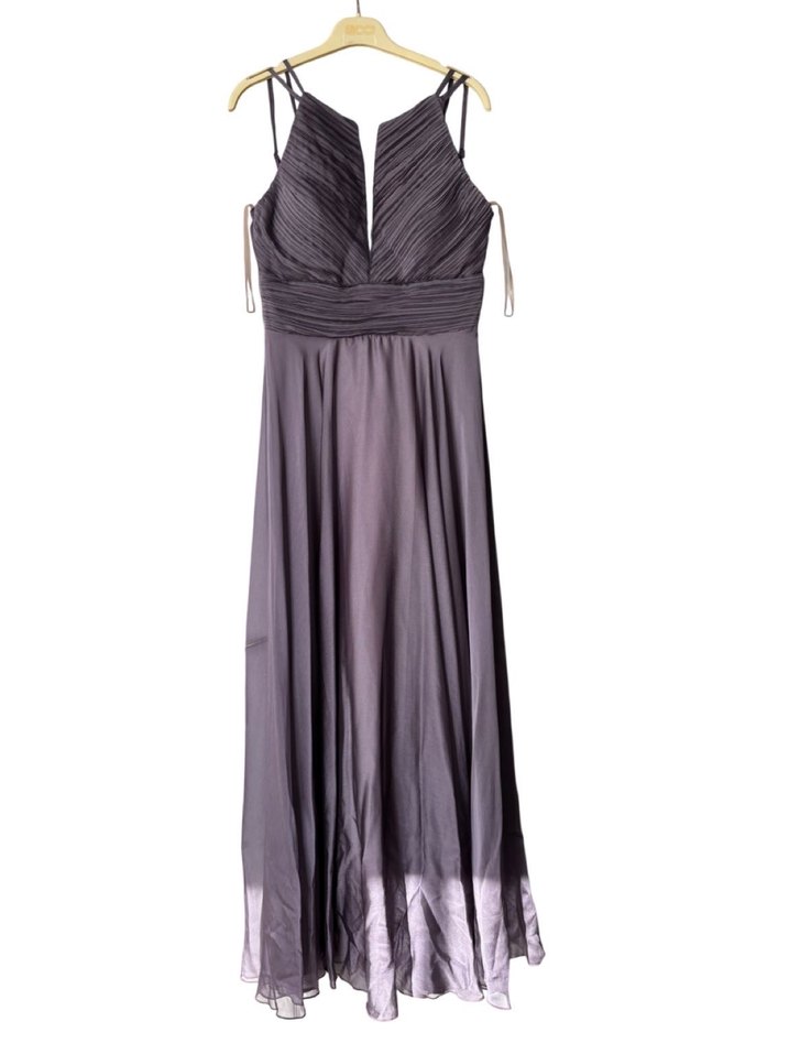 Bu mor uzun abiye elbise, drapeli gövde, V yaka ve askılı kollara sahiptir. Fitted kesimi ve şık duruşu ile düğünler için uygundur. Göğüste kupları var 1 kere giyildi lila gri arası çok şık bir renkte Göğüs 84 Roba72