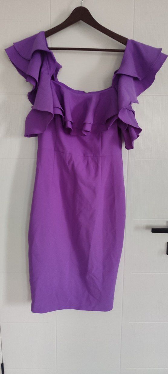 Mor uzun askısız elbise, fırfır detaylı ve vücuda oturan kesime sahiptir. Kolsuz tasarımıyla şık bir parti kıyafetidir.