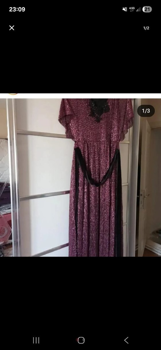 Mor renkte, bol kesim ve dökümlü tasarıma sahip uzun elbise, askılı kollar ve V yakalıdır. Koyu batik deseni ve vintage tarzı partiler için uygundur.