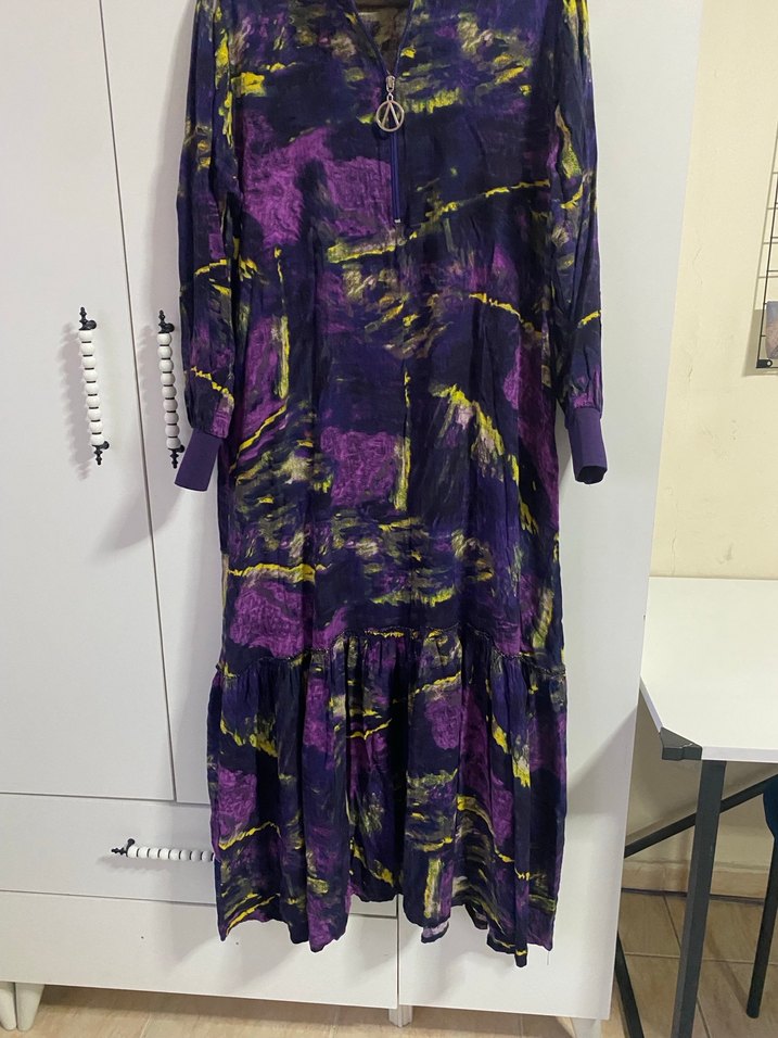 Mor ve sarı tonlarında bağlama desenli, uzun, bol kesim elbise. Uzun kollu, V yakalı ve piliseli detaylara sahip. Sentetik kumaştan, günlük kullanıma uygun.