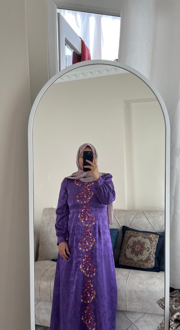 Mor Uzun Bağlama Desenli Tesettür Elbise el dikimi