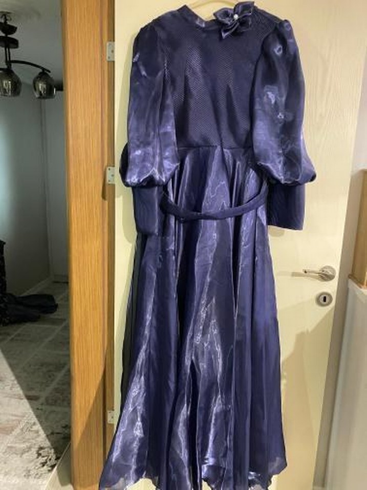 Mor, uzun, bağlamalı ve bol kesimli gotik kadın elbisesi yüksek yakalı ve askılı kolludur, bağlamalı detay ve batik deseni taşır. 1 kere giyildi ikinci el