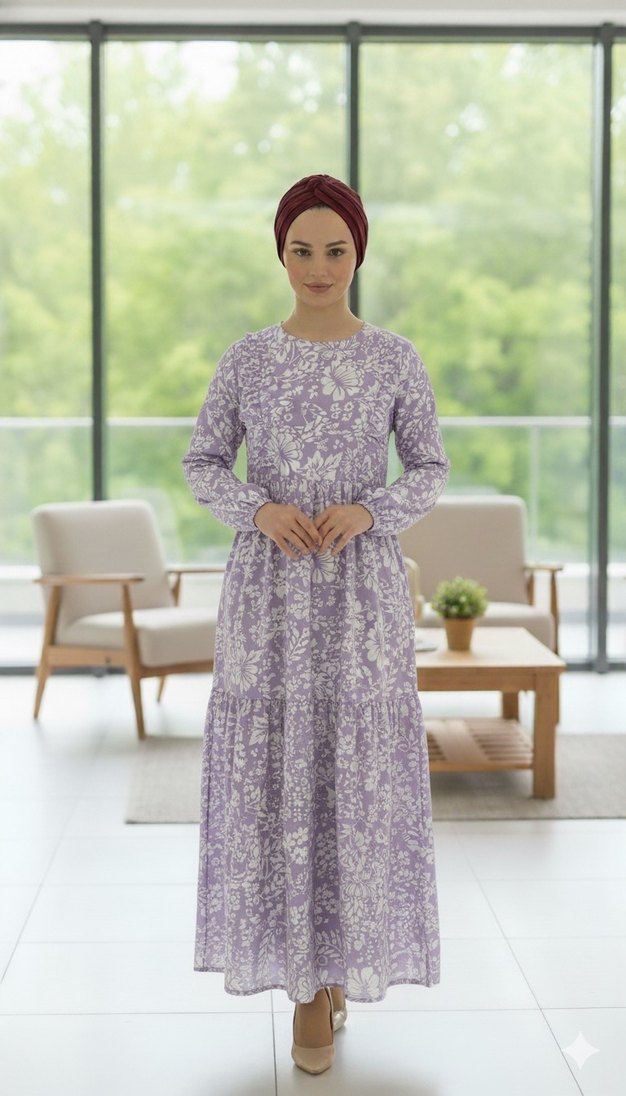 Mor uzun elbise, bol kesim ve drapeli tasarıma sahiptir. Uzun kollu, bisiklet yaka ve pastel tonlarda batik desenlidir.