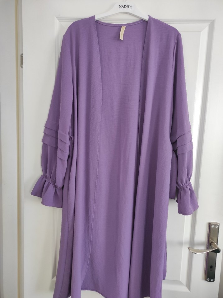 Mor pastel renkte, uzun kollu, bol kesim bohem tarzda kadın sabahlık. Desensiz ve kol detayları bulunur. Marka: NADID.
