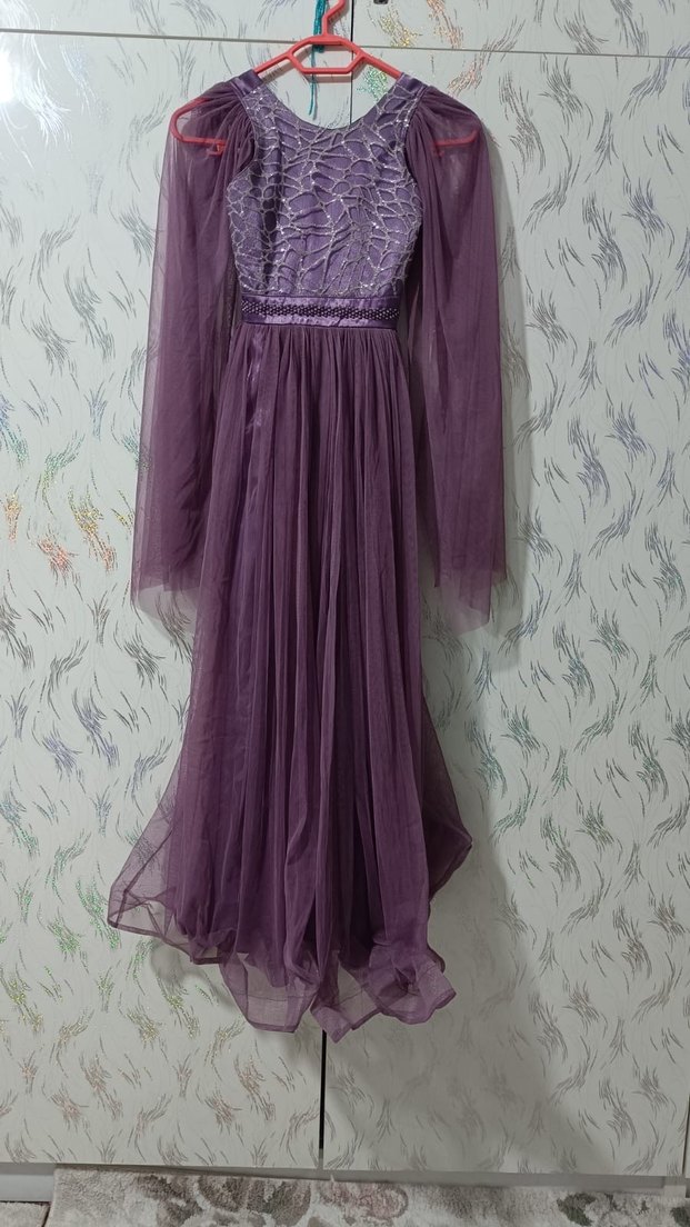Mor uzun abiye elbise, bol kesim ve drapeli nakış detaylarına sahiptir. Uzun kollu ve straplez yakalıdır, düğün ve bohem tarz için uygundur. 13/14/15 yaş arasında giyilebilir