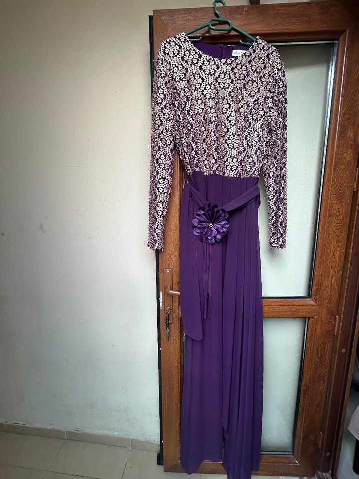 Kadınlar için yüksek yakalı, uzun kollu dantel detaylı üst kısmı ve mor uzun etekli, çiçekli kemer detaylı elbise. Sentetik kumaştan, düzenli kesim, düğünler için uygun.