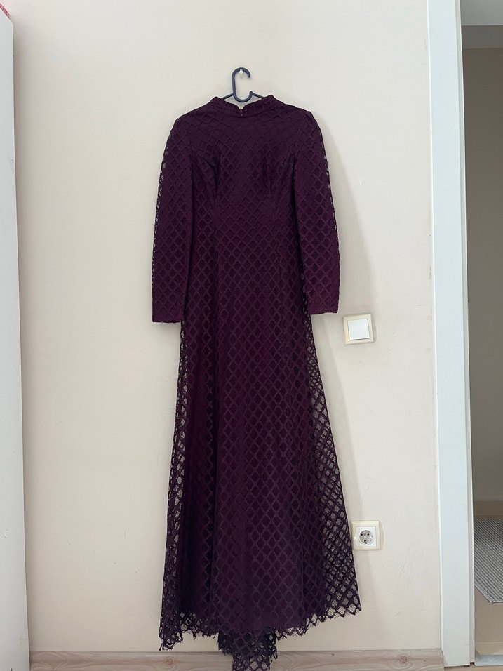 Mor renkte, uzun kollu ve yüksek yakalı, dantel detaylı, vücuda oturan uzun elbise. Yumuşak sentetik kumaştan, düğünler için uygun.