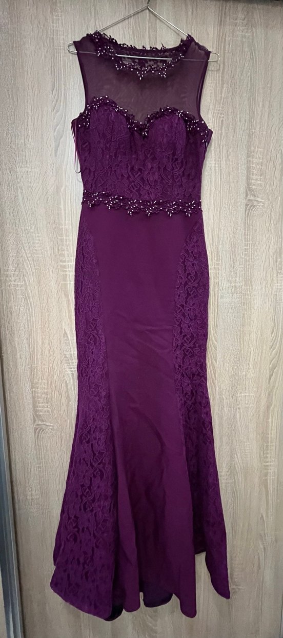 V yaka, kolsuz ve dar kesim mor uzun abiye elbise, dantel ve işlemeli detaylara sahiptir. Klasik, göz alıcı gotik tarzda, düğünler için uygundur.