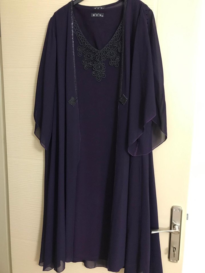Mor, uzun ve bol kesim kadın elbisesi, satenimsi kumaşla drapeli tarzda. V yaka ve işlemeli detaylı, kolsuz modeliyle gotik klasik şıklık sunar. Düğünlere uygun.