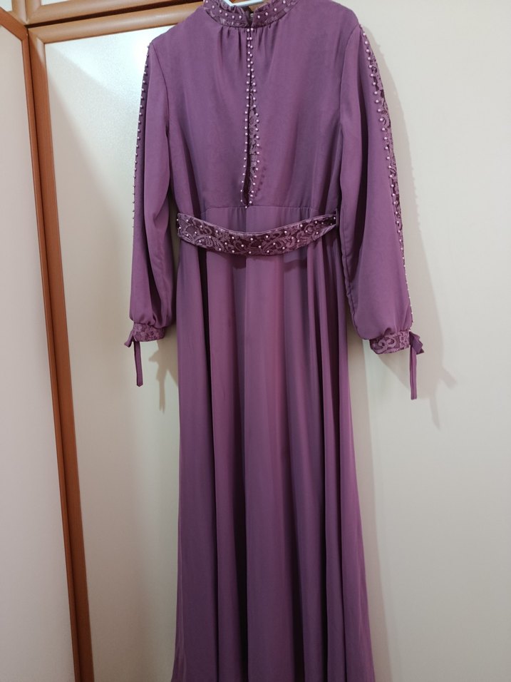 Mor uzun drapeli elbise, yüksek yaka ve bol kesim. Kemer ve manşetlerde süslemeler, ince askılı kollar. Düğün için uygun.