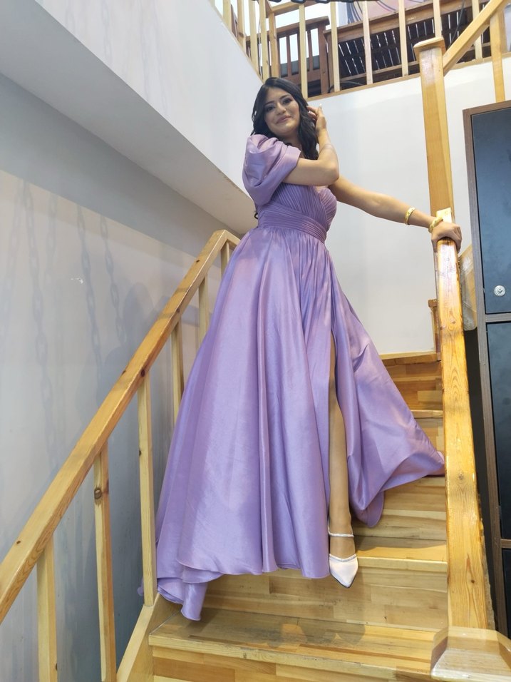 Mor renk, uzun ve drapeli tasarıma sahip abiye elbise. Straplez yakalı ve ince askılı, parlak ve desensiz kumaştan yapılmıştır. Bohem ve gösterişli tarzda, malum 1 kez giyildi biraz pahalıya almıştım, kol kısmının iç tarafına fondöten bulaşmış görselde belirttim.