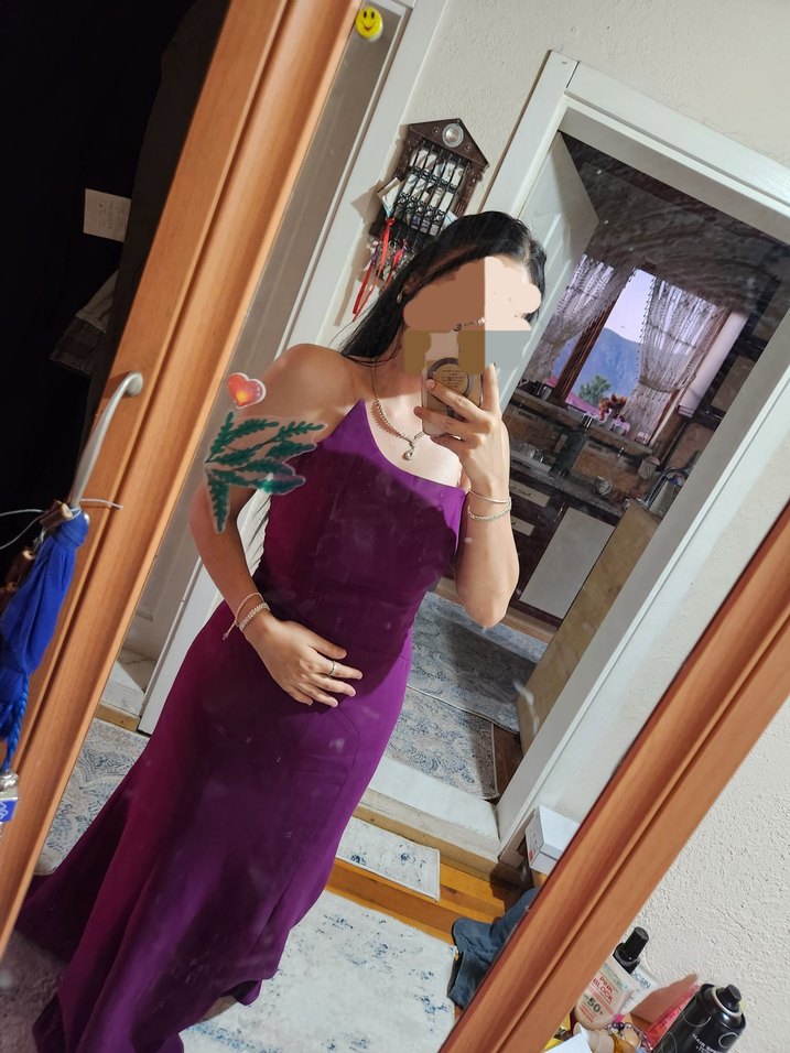 Mor, uzun, drapeli ve ince kesim olan bu abiye elbise, ipeksi kumaştan üretilmiştir. Bohem tarzıyla düğünler için uygundur.