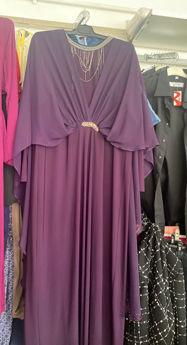 Mor, parlak sentetik kumaştan uzun, bol kesim hamile abiye elbise. V yaka, drapeli ve askılı kollu, desenli bohem tarzda, düğün için uygundur.