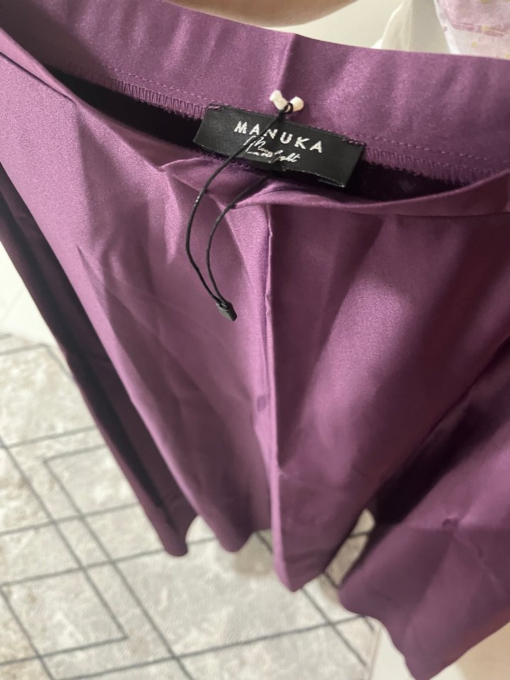 Mor renginde, ipeksi dokulu, uzun ve drapeli tasarıma sahip hamile eteği. Düzenli kesimi ve baskılı deseniyle günlük kullanıma uygun.