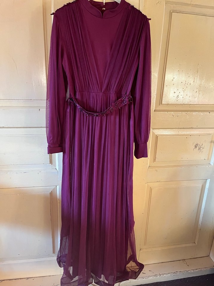 Şalıyla birlikte gönderim olucaktır Mor renkli uzun abiye elbise, drapeli tasarımı ve yüksek yakası ile dikkat çeker. Bol kesim ve klasik vintage tarzda, düğünler için uygundur. 46 beden 95 kiloya kadar oluyor sadece arkasında küçük yırtığı mevcut