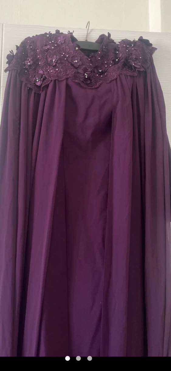 Mor renkte, drapeli uzun kadın abiye elbise. Kayık yaka ve kolsuz tasarımıyla bol kesim sunar. Gotik ve avangart tarzlar için uygundur.