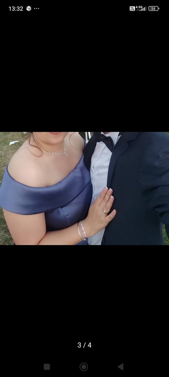 Fıtıllı, uzun ve parlak mor renkte, drapeli kayık yaka ve askılı kollara sahip kadın abiye elbisedir. bir kez giyildi 1.62 boyum 82 kiloydum kilo aldığım için satıyorum