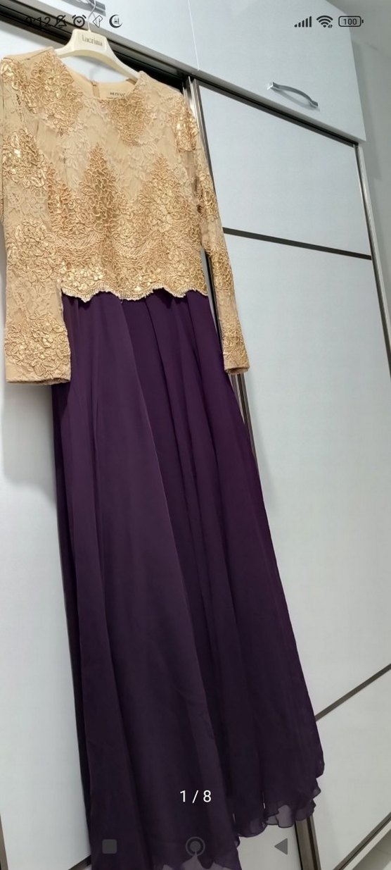 Mor tonlarda, straplez yaka ve uzun kollu, drapeli ve desen içermeyen, bol kesim kadın abiye elbise. Düğün ve özel davetler için uygundur.