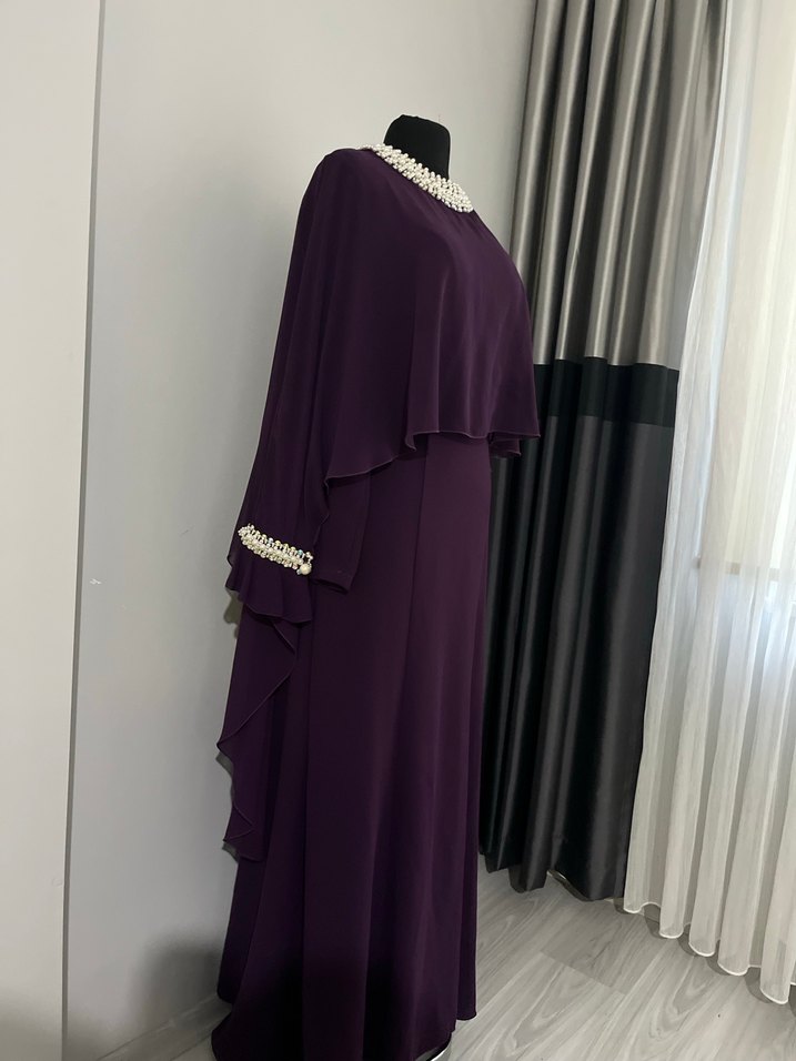 Mor uzun elbise, dökümlü ve balık kesim . İpek gibi kumaşı, uzun kollu ve yuvarlak yaka detayları inci süslemelidir. Abiye şıklık için uygundur.