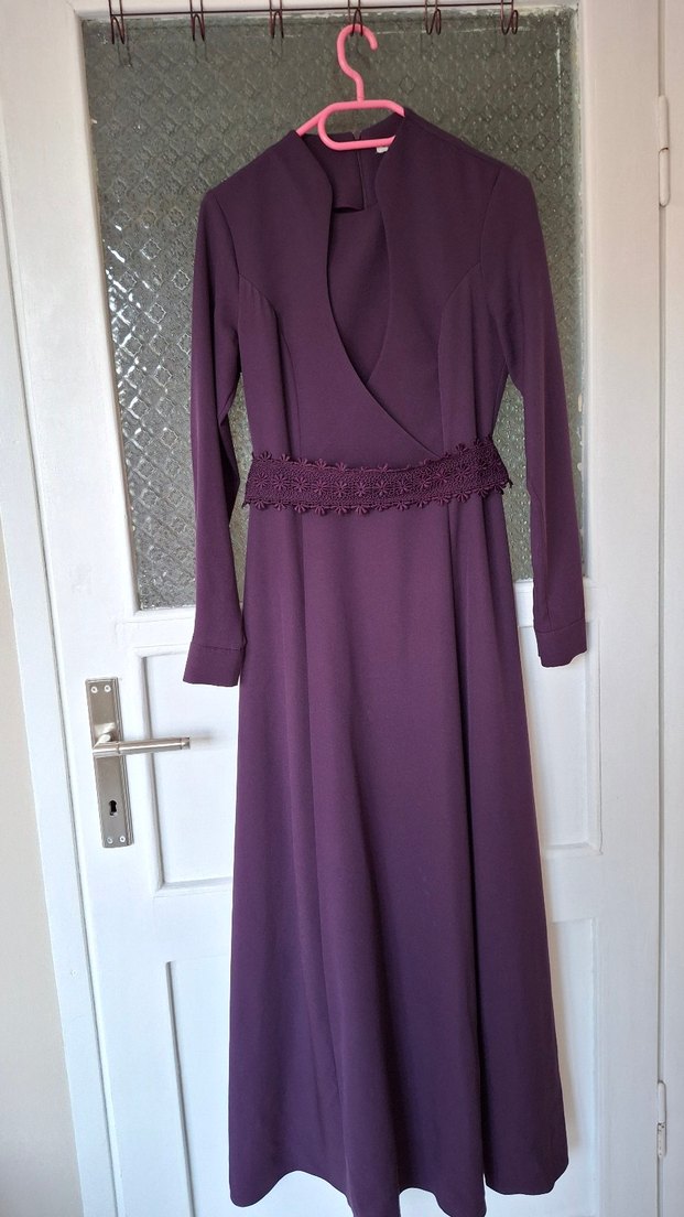 Bu mor uzun kadın elbisesi, drapeli tasarımı, yakalı ve uzun kollu yapısıyla dikkat çeker. Orta beden kesimi ve süslemeli bel detayıyla ofis için uygundur.