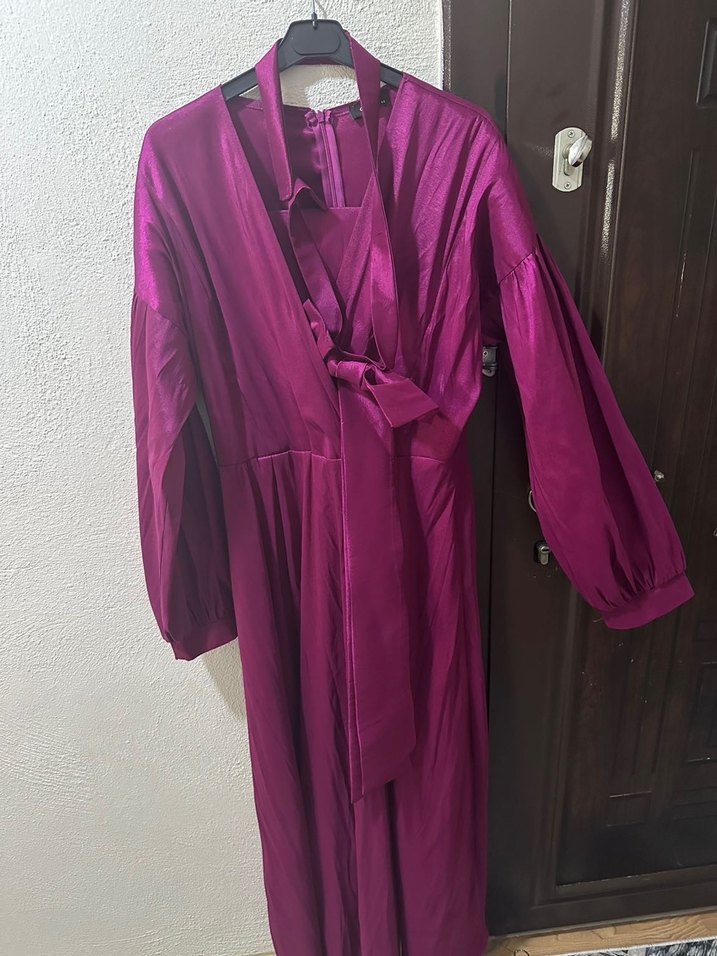 Mor renkte, uzun kesim ve drapeli tasarıma sahip kadın elbisesi. İpek gibi yumuşak kumaş, V yaka ve askılı kol detaylarıyla ofis için uygun.