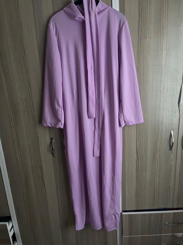 Pastel mor renkte, yüksek yakalı ve uzun kollu, bol kesim drapeli uzun elbise. Yumuşak sentetik kumaştan, minimalist ve şık tarz için uygun.