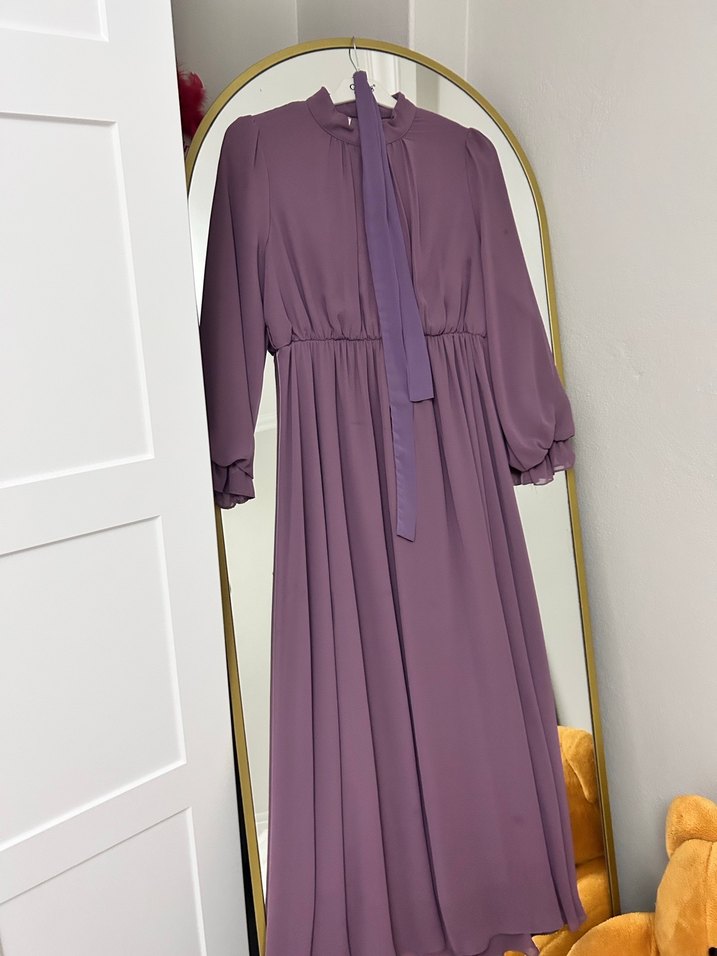 Mor uzun elbise, yüksek yakalı ve drapeli bağcıklı tasarıma sahiptir. Yumuşak sentetik kumaştan, bol kesim ve manşetleri büzgülü uzun kolludur, ofis için uygundur.