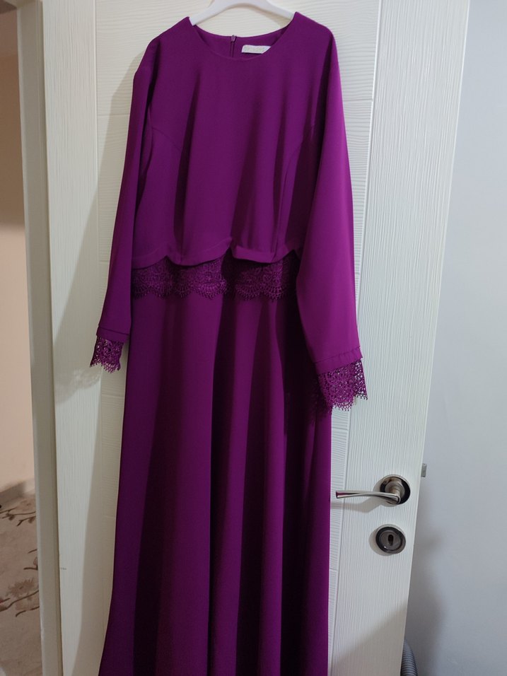 Mor renkli, uzun ve bol kesim elbise, drapeli detaylara ve dantel süslemeli uzun kollara sahiptir. Yuvarlak yakalı ve modern klasik tarzda, ofis için uygundur.