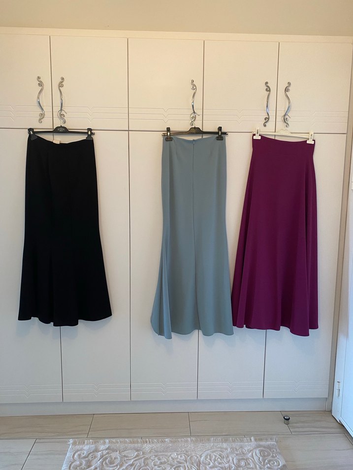 Mor uzun etek, bol kesim ve drapeli tasarıma sahip. Pürüzsüz sentetik kumaştan yapılmış, minimalist tarzıyla günlük kullanıma uygun.