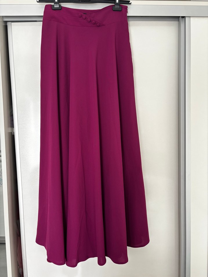 Mor renkli uzun etek, drapeli ve bol kesimdir. Ofis için uygun, sade ve desen içermeyen tasarıma sahiptir. Bel kısmında düğme detayları bulunur. Hiç giyilmedi. 0 ürün. İçinde belli bir yere kadar astarı var. Cepleri var Uzunluk 104cm; bel genişliği 32cm,