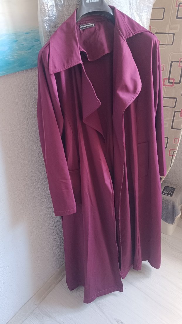 Mor renkte, uzun kollu, bol kesim ve drapeli tasarıma sahip kadın kabanı. Notlu yaka ve yumuşak sentetik kumaştan üretilmiştir. Minimalist tarzda, günlük kullanım için uygundur.