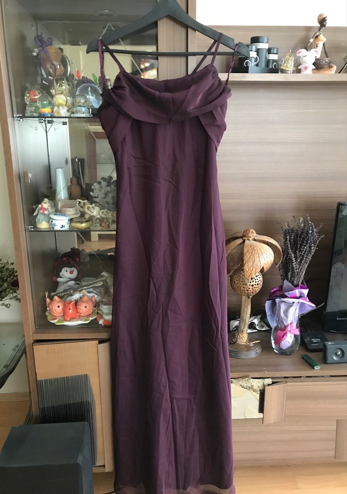 Mor renkte, uzun ve dar kesim abiye elbise, drapeli straplez yakası ve kolsuz tasarımıyla düğünler için uygundur. Gotik ve Paris tarzı bir görünüm sunar.s/m uyumlu. Bir kez giyilmiş ithal abiye