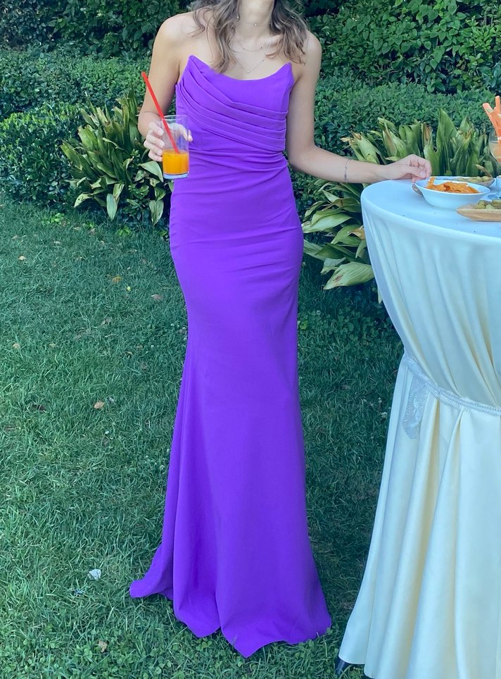 Mor uzun abiye elbise, drapeli straplez yakalı,göğüs kısmı süngersiz ben direkt straplez sütyen ile kullandım . Kolsuz ve desensiz, düğünler için uygun. Boyu 140 cm. Bel kısmı 33 cm. Tadilat yok hiçbir sıkıntısı yok. 1 kez düğünde giydim birdaha kullanmadım sizde alıp 1 kez giyin diye satıyorum