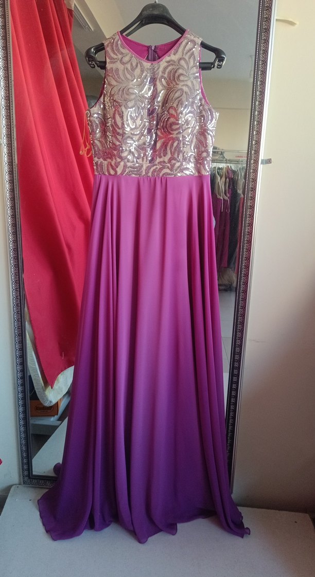 Mor uzun drapeli, straplez ve kolsuz abiye elbise, parlak batik desenli üst kısmı ve düzenli kesimiyle düğünler için uygun.