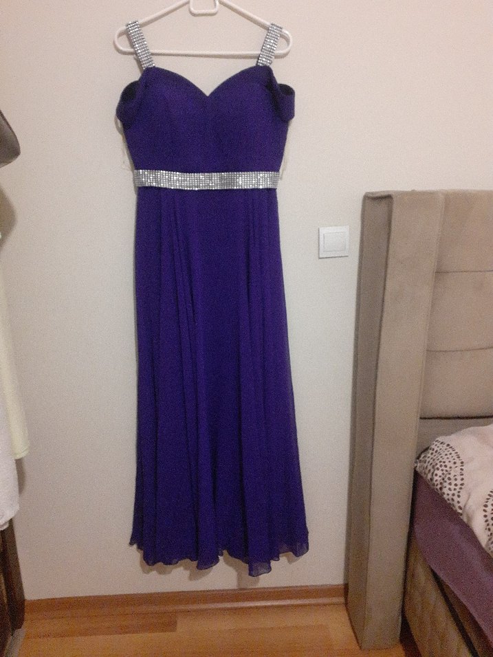 Bu mor uzun abiye elbise, straplez yaka, drapeli detaylar ve parlak omuz askıları ile tasarlanmıştır. Belinde taşlı süsleme bulunur. Düğünler için uygundur.