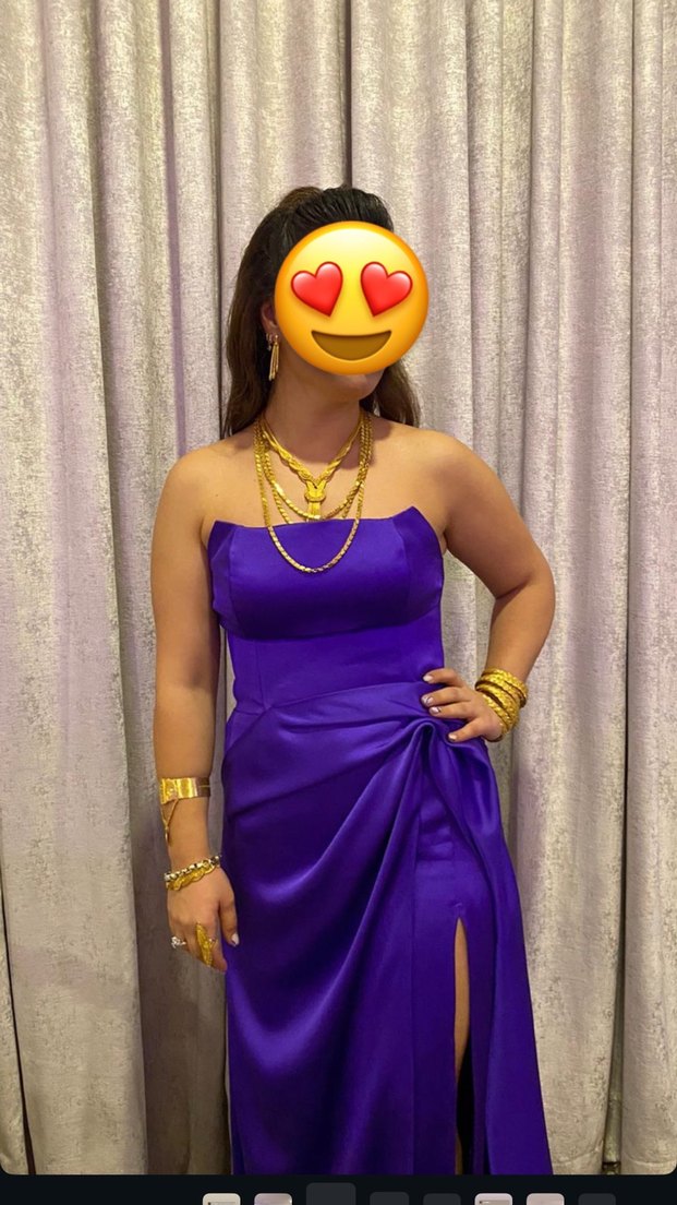 Özel dikimdir mor renkte, straplez ve drapeli detaylara sahip uzun, vücuda oturan gece elbisesi. Yanında yırtmaç bulunur, arkası ipli olduğu için 38 40 bedene çok uygun 42 bedene kadar uyumlu