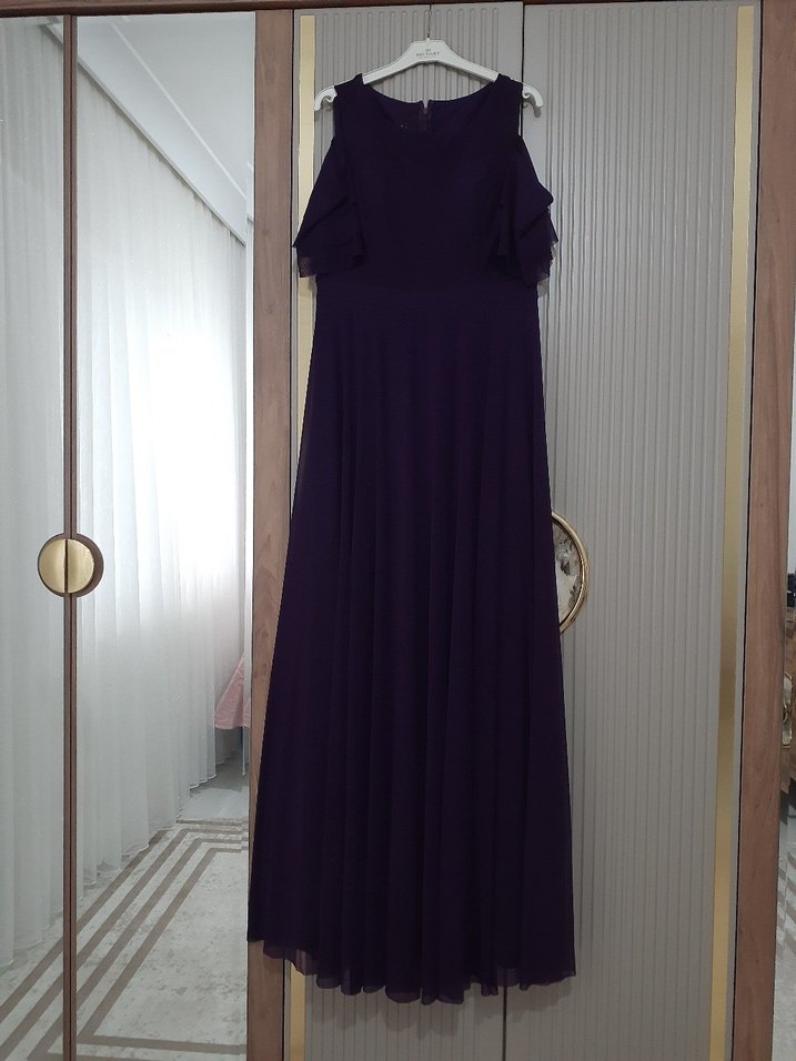 Mor uzun, straplez, drapeli ve salaş kesim kadın abiye elbise. Gotik tarzda, klasik zarafet sunar. Kollu olmayan modeliyle düğün için uygundur.