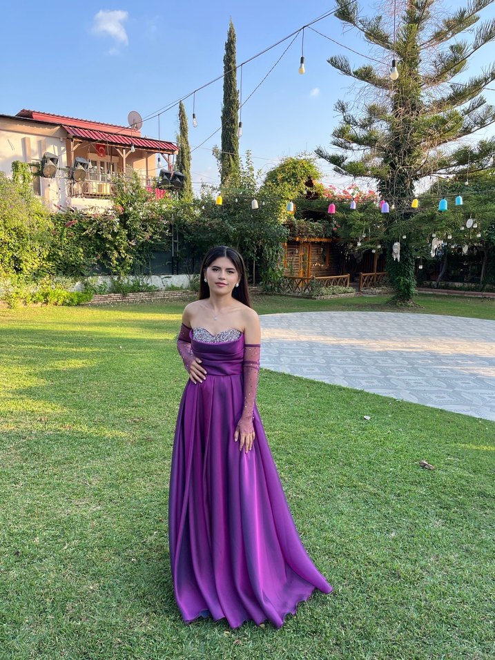 Sadece 1 kez düğünde giyildi. Mor uzun abiye, straplez yaka ve drapeli tasarıma sahiptir. Parlak batik desenli, regular fit, düğün gibi özel anlar için uygundur. Kolsuz ve goth tarzında şık bir modeldir.