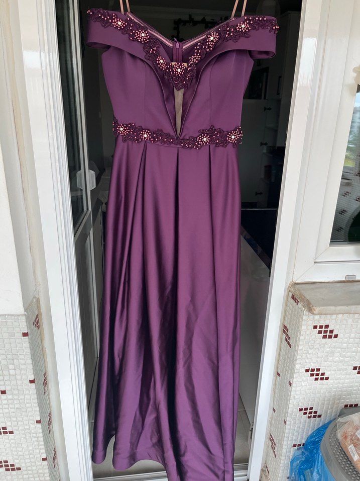 Bu mor, drapeli ve straplez detaylı abiye elbise, uzun ve parlak süslemelidir. Düğünler için klasik ve modern bir şıklık sunar.