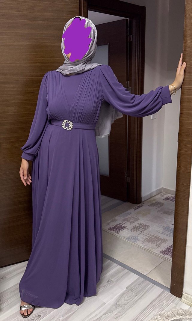 Mor renkte, uzun kollu, yüksek yakalı ve drapeli detaylara sahip, bol kesim tesettür abiye elbise. Belinde süslemeli kemeri vardır. Kemerdeki taşlar takılıp çıkarılabiliyor . Taşlardan 1 tanesi düştü taşı çıkarıp sadece kemerle de fotoğrafını çektim inceleyebilirsiniz. Temiz kullanıldı.42-44 uyumludur.MARKA TEMSİLİDİR.Gönül rahatlığıyla alabilirsiniz.Tekliflere açığım