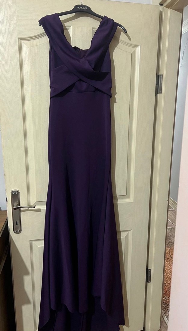 Koyu mor renkte, drapeli ve V yakalı, kolsuz ve vücuda oturan uzun abiye elbise. Düğünler için uygundur.