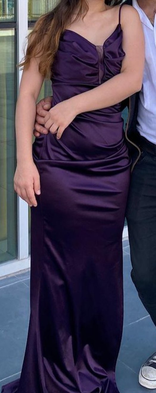 Mor renkli, uzun ve vücuda oturan gece elbisesi, drapeli tasarımı ve V yaka ince askılarıyla romantik gece buluşmaları için ideal, gotik Paris tarzında.
