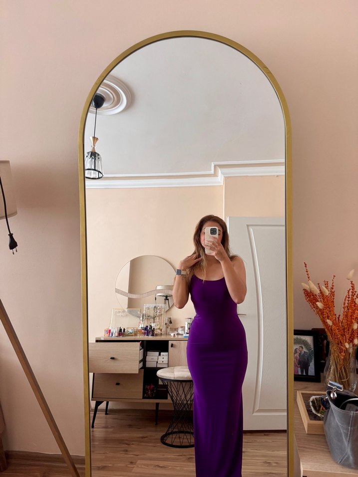 Koyu mor renkte, ince askılı vücuda oturan elbise,
