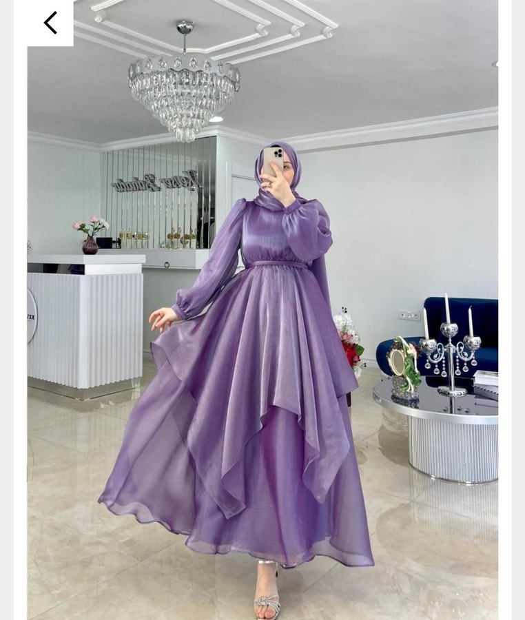 Mor uzun elbise, yüksek yakalı ve uzun kollu, drapeli ve bol kesimli tasarıma sahiptir, düğünler için uygundur. 38-40 beden