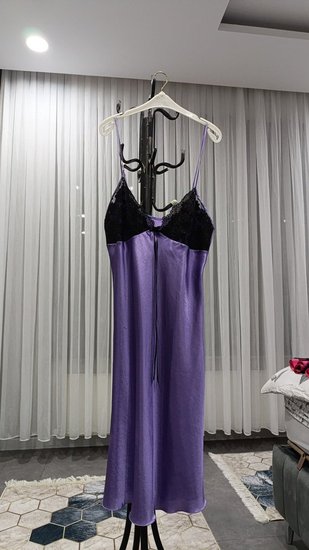 Mor ve siyah dantel detaylı, ince askılı, uzun ve vücuda oturan gotik tarzda gecelik. Hafif batik desen içerir.