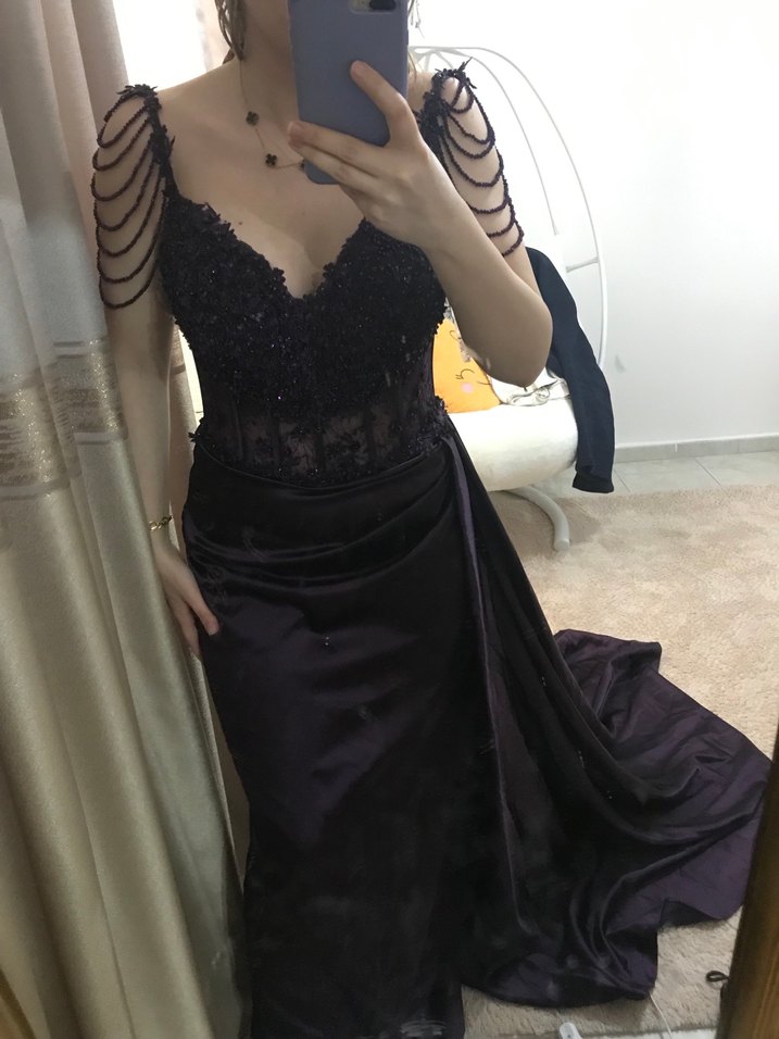 Mor tonlarda, straplez yaka ve askılı kollara sahip, desenli ve drapeli uzun gotik abiye elbisedir. Düğünlerde kullanıma uygundur.